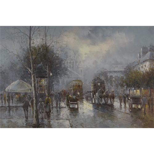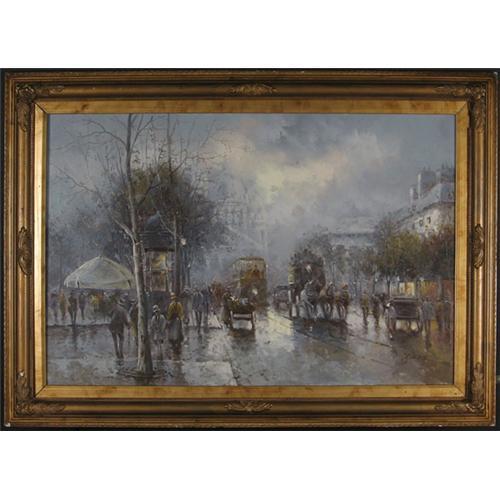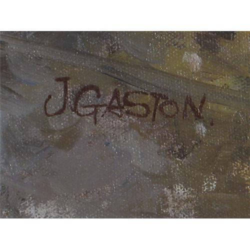 OIL ON CANVAS 24'' x 36'', Johnny Gaston (20th century). A Parisian Street Scene. Signed lower right. Note small water spot upper center and crack/crease line center top. Placed in a goldtone frame, note condition. More info. in the white binder.
