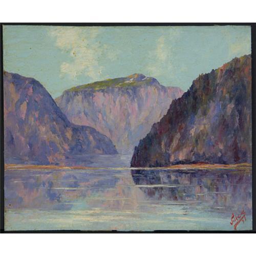 OIL ON CANVAS 10'' x 12'', Jules Bernard Dahlager (1884-1952), Alaska. Lake and Glacier Valley. Signed ''Jules'' and dated ''41'' lower right. Unframed and unstretched. Apparent smoke residue throughout. Dahlager, one of Alaska's most popular artists, is a member of the ''Alaska Four'' which, in addition to Dahlager, includes Eustace Ziegler, Ted Lambert and Sydney Laurence. The pieces offered in this month's auction came directly from the estate of Jules Dahlager. More info. in the white binder.