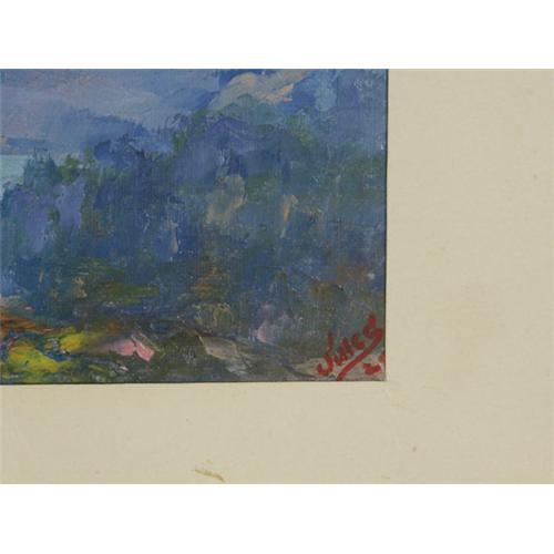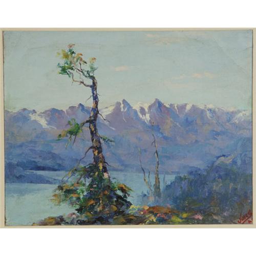 OIL ON CANVAS 9'' x 11'', Jules Bernard Dahlager (1884-1952), Alaska. Mountain Scene with Trees in the Foreground. Signed ''Jules'' and dated ''28'' lower right. Matted, unframed and unstretched. Light soil and possible smoke residue throughout. Dahlager, one of Alaska's most popular artists, is a member of the ''Alaska Four'' which, in addition to Dahlager, includes Eustace Ziegler, Ted Lambert and Sydney Laurence. The pieces offered in this month's auction came directly from the estate of Jules Dahlager. More info. in the white binder.