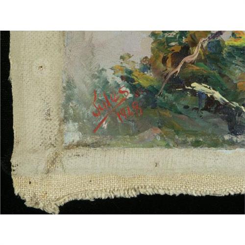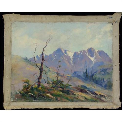 OIL ON CANVAS 7 3/4'' x 10'', Jules Bernard Dahlager (1884-1952), Alaska. Weathered Trees on a Hilltop. Signed ''Jules'' and dated ''1928'' lower left. Unframed and unstretched. Note condition. Dahlager, one of Alaska's most popular artists, is a member of the ''Alaska Four'' which, in addition to Dahlager, includes Eustace Ziegler, Ted Lambert and Sydney Laurence. The pieces offered in this month's auction came directly from the estate of Jules Dahlager. More info. in the white binder.