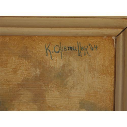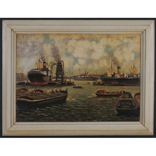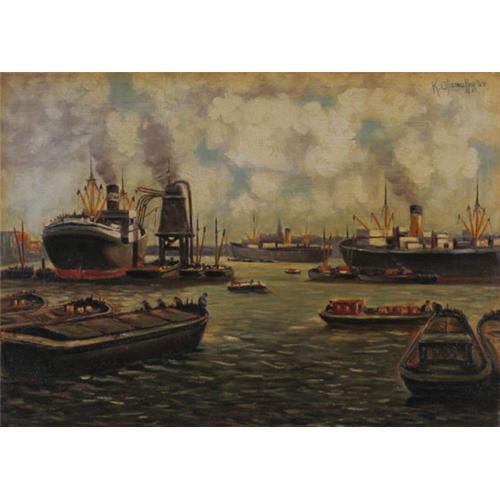 OIL ON CANVAS 20'' x 27 1/2'', K. Oliemuller. ''View of Maashaven, Rotterdam''. Signed and dated '64' (1964) upper right. Paper label with artist info. on the verso. Restoration of small tear center left (visable from the verso). Overall darkening (possible smoke residue). Placed in a period appropriate cream-washed frame.