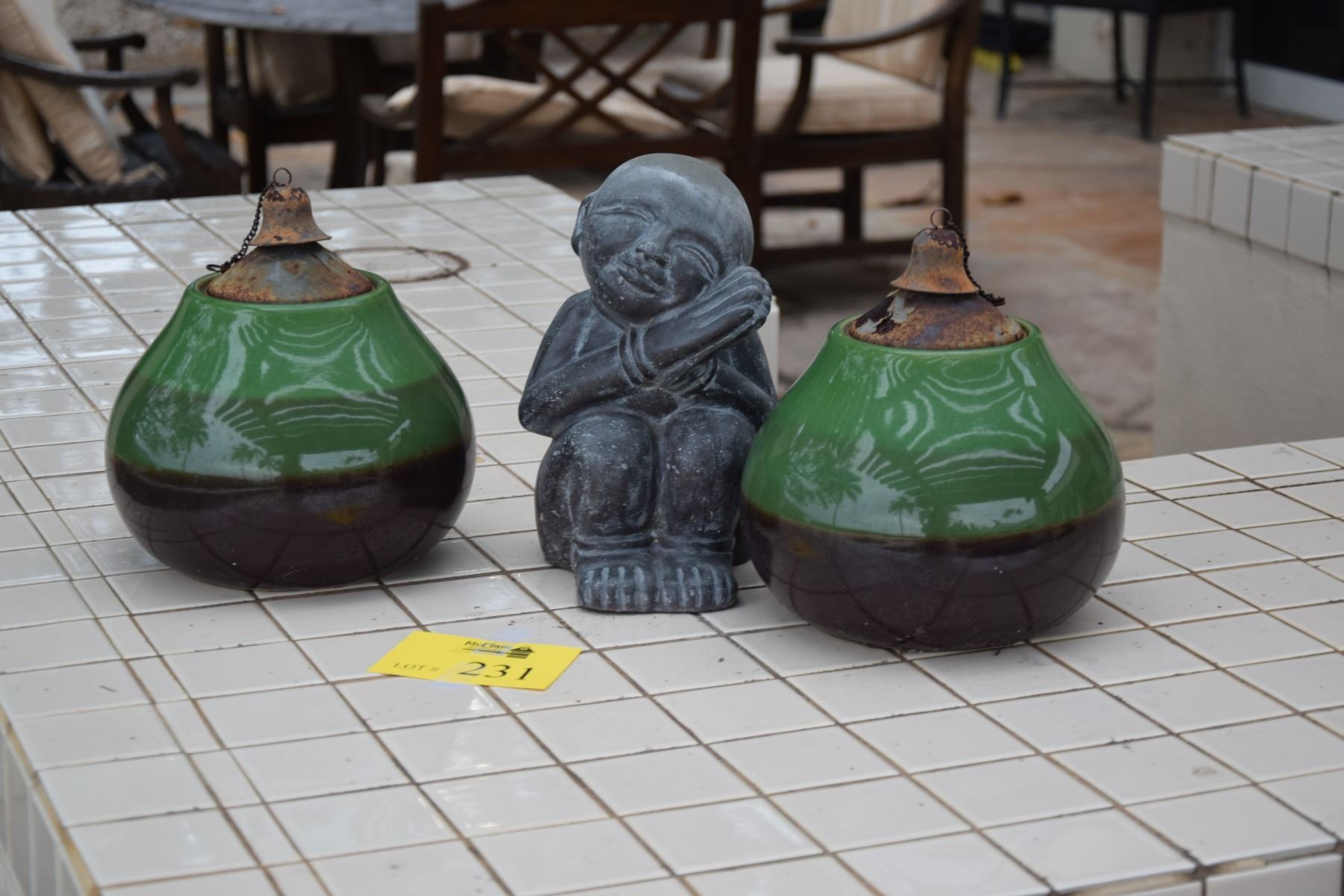 OIL LAMPS & GARDEN STATUE (3 PCS)