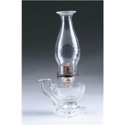 Lot 44 OIL LAMP T1-302G Greek key decorated clear glass lamp. SIZE: 13” t. CONDITION: Roughage to base. 5-70273