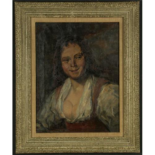 OIL ON CANVAS 18 1/4'' x 13 3/4'', Unsigned. A Laughing Young Woman in Period Dress. Late 19th, early 20th century. Small scrapes, as seen. Placed in a gold, green and white washed frame with beige fabric matting.