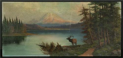 OIL ON PANEL 12'' x 25 3/4'', Leroy Dayton Updyke (1876-1959), WA. Lone elk in the foreground of Mt. Rainier. Signed lower right. Circa late 19th, early 20th century. Unframed. Note condition to include scrape center top, small tear lower left and chipping. Updyke was a Northwest artist who, in addition to smaller works, painted murals including pieces for U.S. world fairs. More info. in the white binder.