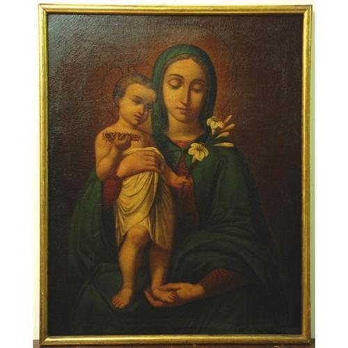 DESCRIPTION: MADONNA WITH LITTLE CHILD. MASTERPIECE OF XVIII CENTURY. The painting that we propose you is a museum masterpiece. The devotional subject of Madonna With Child is interpreted through the emphasis of intimate looks. The painting has a triangular structure (refer to the Trinity) and represents the Madonna holding Jesus Child standing in hand with the crown of thorns, prefiguration of Christ's Passion, and the lily, a symbol of purity. The human figures are immersed in a timeless, caught from a transparent, warm, incorrupt light as if they will know neither 'hours' nor seasons. The uniform darkness of the background lets us focus on the figures, dilated and closer to the spectator. The Madonna holds the child on her lap standing that, with clear and touching gesture, turns his head down. The Madonna, portrayed here recalls a more tender mother rather than a severe Queen of Heaven, her eyes are gentle and facing down. The use of intense light emphasizes the two figures but the tenderness of the mother-child conversation reveals an all female poetry, a poetry that is joined to the eye for details with which the two faces are painted. The painting is executed with a technique highly developed and refined, the use of warm and deep colors, the stretch of the design raise this work at the undisputed masterpiece, by placing yet by the end of the eighteenth century.