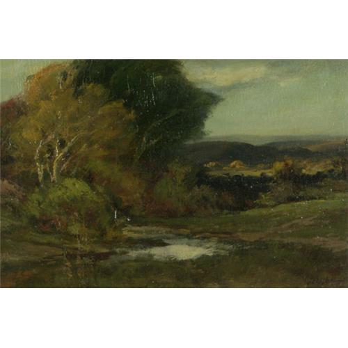 OIL ON PANEL 11 1/2'' x 17 1/2'', Manuel Valencia (1856-1935), CA. Landscape with Buildings in the Distance. Signed lower right. Artist and provenance info. on the verso. Crazing and darkening commensurate with it's age. Note restoration lower left. Placed in a gilt frame. Valencia was born into one of California's oldest families who held land grants in the Bay area. He was a self-taught, prolific painter who focused on historic images and landscapes of his native Northern California.