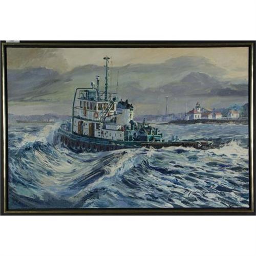 OIL ON CANVAS 24'' x 36'', Marshall Johnson, WA. ''Rounding Alki''. Signed lower right. Signed, dated ''1981'' and titled on the verso. Gallery label from the Stillwater Gallery on the verso. Floating presentation in a wood frame with gold trim. More info. in the white binder.