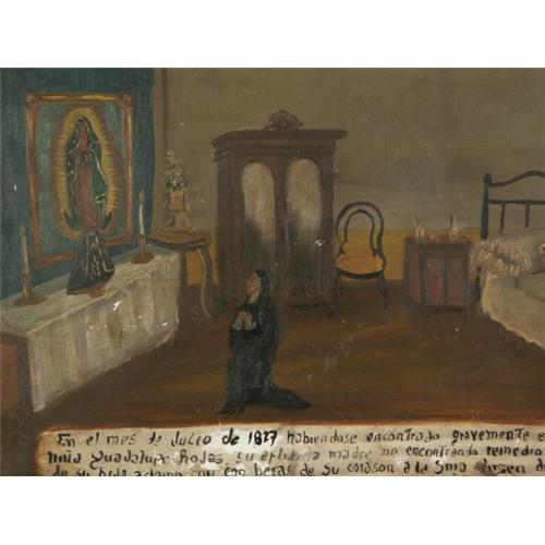 OIL ON TIN 11 1/4'' x 15 1/8'', Unsigned. Mexican Ex-Voto (religious folk painting used as an offering in anticipation or thanks for a prayer answered). Depicts a woman praying for the recovery of her loved one. Writing in Spanish along bottom section detailing the situation. Likely 19th century. Some scrapping throughout, two nail holes upper left and right. Unframed.