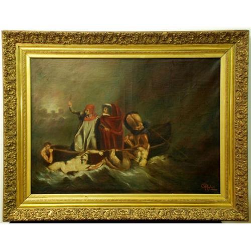 DESCRITPION:? THE BARQUE OF DANTE?. MUSEUM REINTERPRETATION AFTER DELACROIX. The painting in question is a museum reinterpretation of the homonymous painting by the Great Master Delacroix. The shared influence of Michelangelo and Rubens is manifest here, but there is also a savour of the revolution and impressionist style. The original painting, Delacroix?s one was submitted to the Salon in 1822, and makes clear acknowledgement of its debt to Géricault's The Raft of the Medusa. Indeed, the influence of that painting can be traced for many years afterwards in Delacroix's work, for example, in his Christ on the Lake of Gennesaret (1854) or The Shipwreck of Don Juan (1840). The 'stage-setting' of The Barque of Dante looks forward to Baudelaire's pronouncement that Delacroix is an 'essentially literary' painter. But Delacroix had something much more important to leam from the Raft. In expressing the predicament of the shipwrecked everywhere in the world, Géricault had laid the foundations of an aesthetic revolution. The Raft of the Medusa marks the first appearance in painting of 'the ugly' and thereby proclaims its scrupulous respect for the truth, however repulsive the truth might be. This concern for truth is integral to the Romantic temperament. The picture depicts the scene in which Dante and Virgil reach the ferry that will take them across the river Acheron and to Hell proper. The ferry is piloted by Charon, who does not want to let Dante enter, for he is a living being. Virgil ...