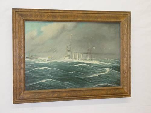 OIL ON ARTIST BOARD OF 2 GERMAN BATTLESHIPS SIGNED E.K. HUSSHEL-1915 (19 3/4" X 30");
