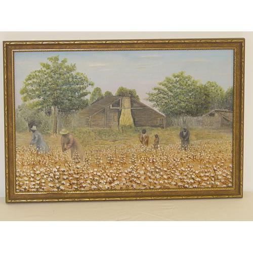 OIL ON ARTISTS BOARD OF RURAL SOUTHERN FARM SCENE W/ PRIMITIVE BUILDINGS & BLACKS PICKING RIPE COTTON BY HAND-UNSIGNED IN A GILT FRAME (9 1/2" X 14 3/4") - USUAL WEAR