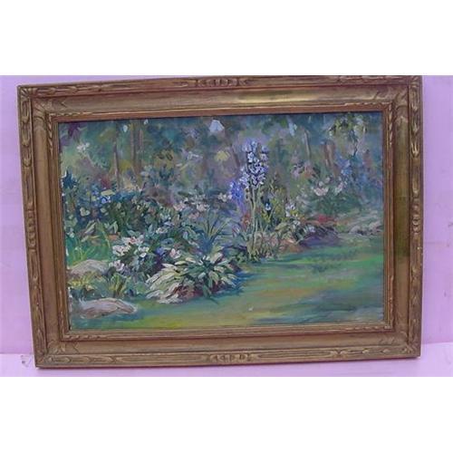 20 3/4" X 28 3/4". This is a nice painting of water and flowers in New England. Signed by Judith Abbe Moore who was a member of the Rockport North Shore Art Association and taught at the Connecticut Silvermine Art School. We believe this painting was painted in the Rockport/Gloucester area in Massachusetts.