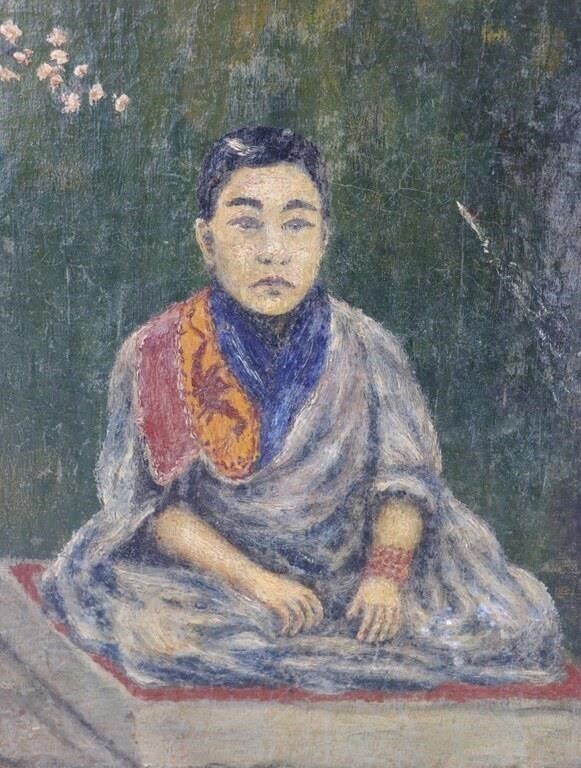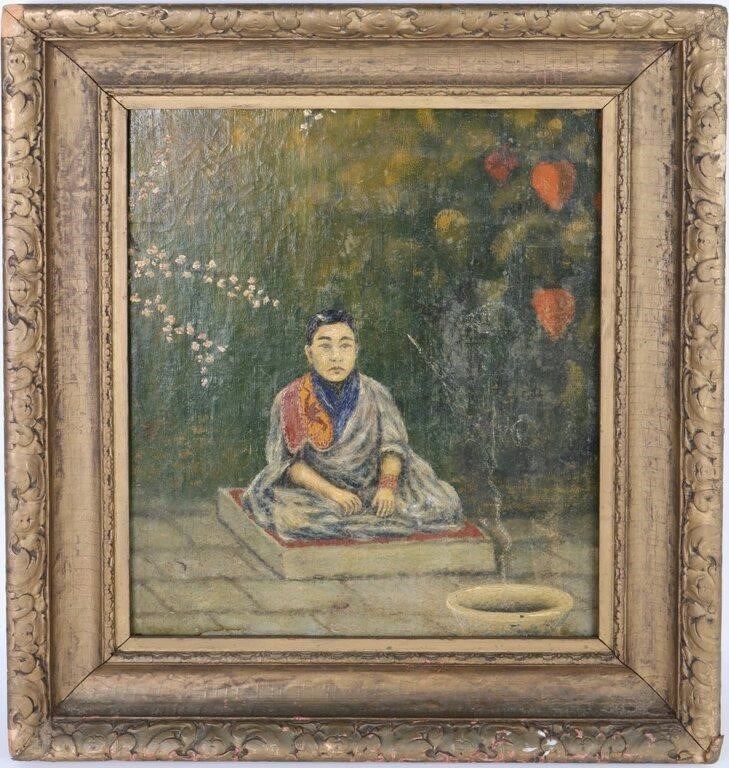 Oil on board depicting an Asian man meditating framed. The artist of this piece is unknown.