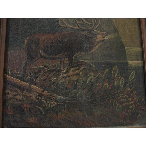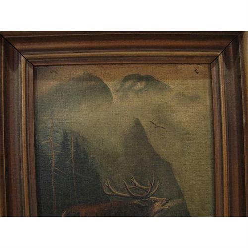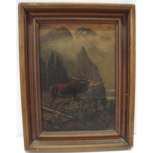 OIL ON BOARD PAINTING OF ELK. Depicts a standing elk near a pond with a mountainous background. Unsigned. In gilt wood frame. 12” x 8.75”. Frame: 15.75” x 12”.
