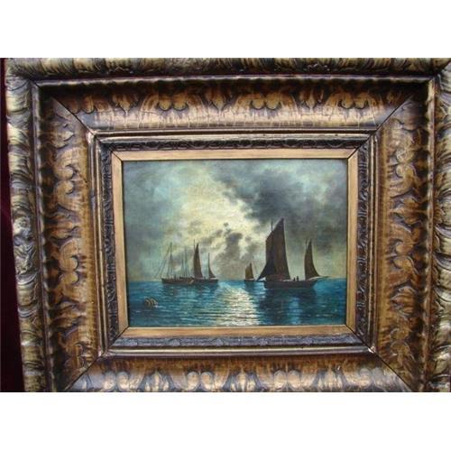 Dated 1915 and signed by B. Church. A Beautiful and very well executed Oil on Board of Ships in a Moonlight Scene on the water. Size of painting is 9 1/2" X 7 1/2' and the overall size including the nice gilded frame is 17 1/4" X 15" X 2 1/4" in Depth. THe artist is English and is listed in Davenports. Good Condition. I have had the painting cleaned by my conservator very lightly. This is a very nice charming painting, of a real nice size, and in Good Untouched Condition. Frame has a few cracks in the corners. I believe the frame is original. Small moonlight Nautical paintings like this are hard to find and very much in demand.