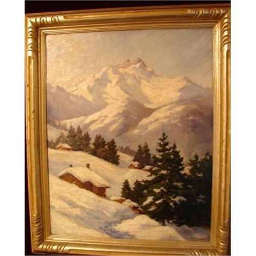 19TH. Century Oil on 16" X 20" Board of winter snow Mountail Landscape with cabins and trees. Signed by Whitney. A very well painted painting set in a nice gilded frame measuring 20" X 24".