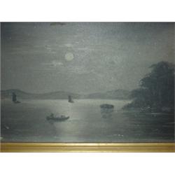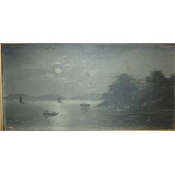 OIL ON BOARD PAINTING OF SEASCAPE at moonlight in gilt frame. Condition is rough with signs of wear. Unsigned. 16.5" x 10" framed.