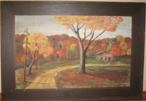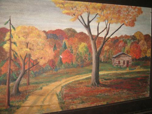 OIL ON BOARD PAINTING. Depicts an autumn landscape scene with dirt road. Signed in lower right “T. McClaire”. 39.25” x 27.25” framed.