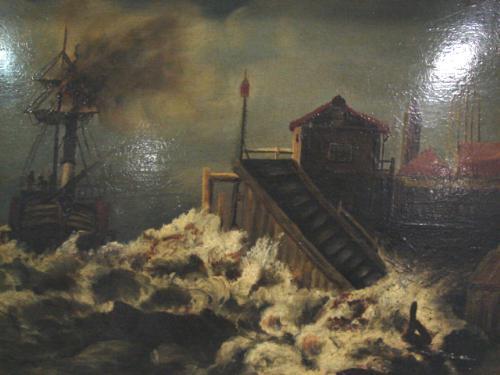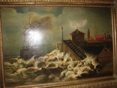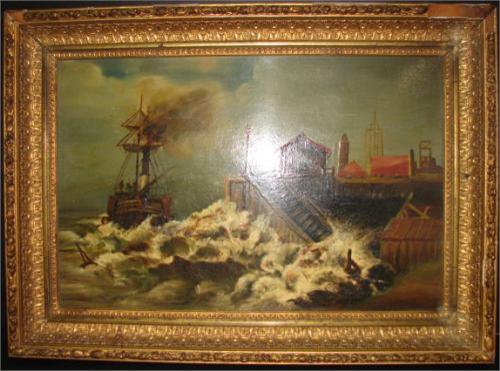 OIL ON BOARD PAINTING. Depicts a ship near a port with crashing waves. Shows some craquelure. Unsigned. Painting rests in gilt wood & gesso frame with shingle back. Frame show some loss to gesso. 16” x 22.25” framed.