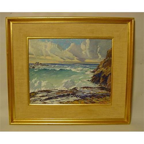 GUSTAVE CIMIOTTI, JR. New York (1875-1969) This is a oil on board with the actual painting measuring 16' X 20". Including the frame this painting measures 26" X 30" We believe this costal scene is off the shore of Maine in the Monhegan Area. This artist is often known for costal view, landscape, and still life. Cimiotti is called the "GRAND MAN OF ROMANTICISM". He was one of the exhibitors at the ARMORY SHOW in 1913 with two entries, "The Barrier" and "Hillside". Source: Milton Brown, "The story of the Armory Show" and MONHEGAN: The Artists Island by Jane and Will Custis and Frank Lieberman.