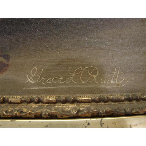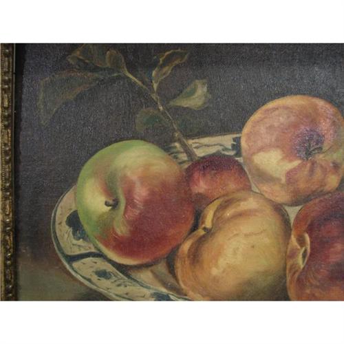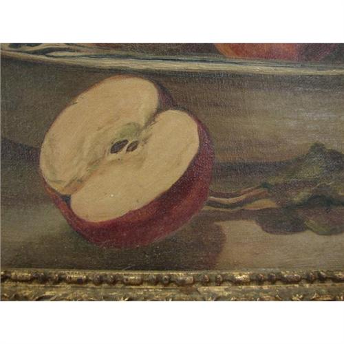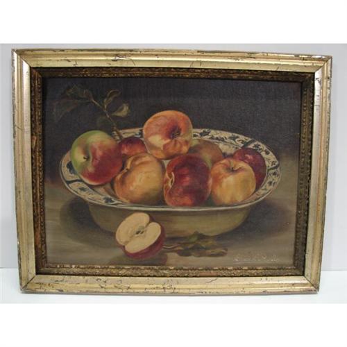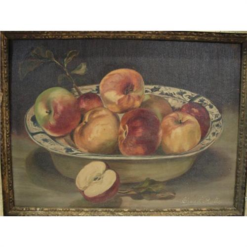 OIL ON BOARD STILL LIFE PAINTING. Painting depicts a group of apples in a porcelain bowl. Signed in lower right “Grace L. Pruitt”. Painting is in gilt wood and gesso frame with a shingled back. 11.75” x 16”. Frame: 14.75” x 18.75”.