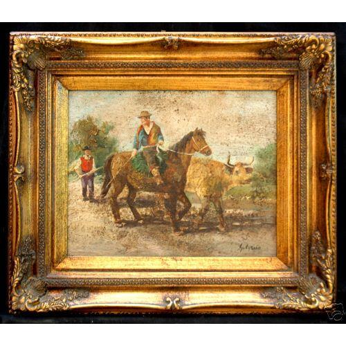 STRIKING COUNTRYSIDE SCENE DEPICTING TWO MEN .ONE OF THEM IS ON A HORSE CARRING A BULL WHILE THE OTHER ONE IS ON THE BACK WALKING FOLLOWING HIS FRIEND