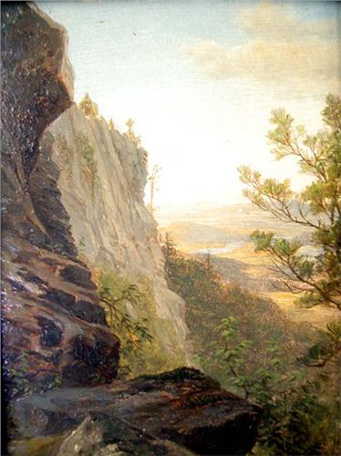 OIL ON BOARD, UNSIGNED; Possibly Hudson River School, depicting a rocky crag looking off to a distant river and mountains, 7 3/4"H x 5 3/4"W.