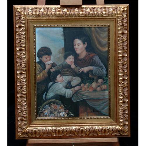OIL ON CANVAS - ORIGINAL WOOD GOLD FRAME. A DISARMING FAMILIAR SCENE: A MOTHER WITH HER CHILDREN - A CAREFUL MOTHER HAS ON HER LEGS ONE OF HER CHILDREN, A LITTLE BABY WHO HAS ROTUND FACE. SHE IS LOOKING ANOTHER CHILD NEAR A FRUIT BASKET ON HER LEFT, WHILE THE BIGGEST CHILD IS MAY BE PLAYING THE HARMONIC.A GREAT USE OF LIGHT ON FACES, A STRONG BRUSH. A DELIGHT FAMILIAR SCENE.