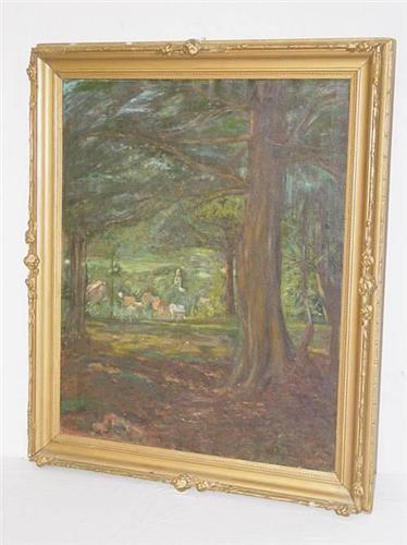 OIL ON CANVAS "A GLIMPSE OF A NEW ENGLAND VILLAGE S. LONDONDERRY VT" (LABEL ON BACK) SIGNED WM. LAVALLEY (29 1/2" X 24 1/2") - LOSSES & REPAINTING TO FRAME;
