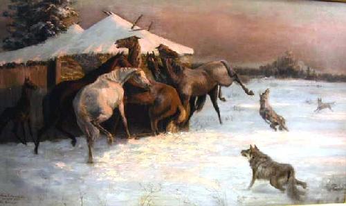 OIL ON CANVAS, ANNA V. HARVEY, 1892; adapted from A.D. Schreyer, depicting horses being attacked by a wolf pack, signed and dated, ll, 24 1/2"h x 42 1/2"w