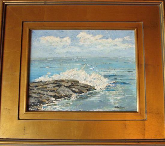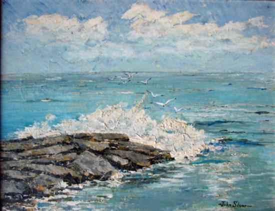An unusually fine and detailed seascape, by John French Sloan was an U.S. artist that became one of the major early 20th-century figures in New York and was apart of the Social Realist movement with Robert Henri and his circle of urban realist. Sloan was an illustrator and early eastern painter in the Southwest. He was intrigued by the beautiful landmarks, mountain and garden landscapes, regionalism, etc. John Sloan was interested in New Mexico since his influence (Robert Henri) spent the summers of 1916 and 1917. After hearing wonderful things about Santa Fe, Sloan and his wife Dolly visited in 1919 and Sloan was inspired by the desert landscape. Sloan later became active in the Santa Fe colony which made artist from the east come to the west. The Eight was a group of artists that included five painters who were associated with the Ashcan School: William Glackens, Robert Henri, George Luks, Everett Shinn, John French Sloan, along with Arthur B. Davies, Ernest Lawson and Maurice Prendergast. The work shown by this group of artists was very diverse in styles, generally dark toned and subject matter. The Eight who exhibited as a group once, at the Macbeth Gallery in New York in 1908, toured the US under the auspices of the Pennsylvania Academy of the Fine Arts. The Eight was their own group in a way and rebelled against the American impressionism.