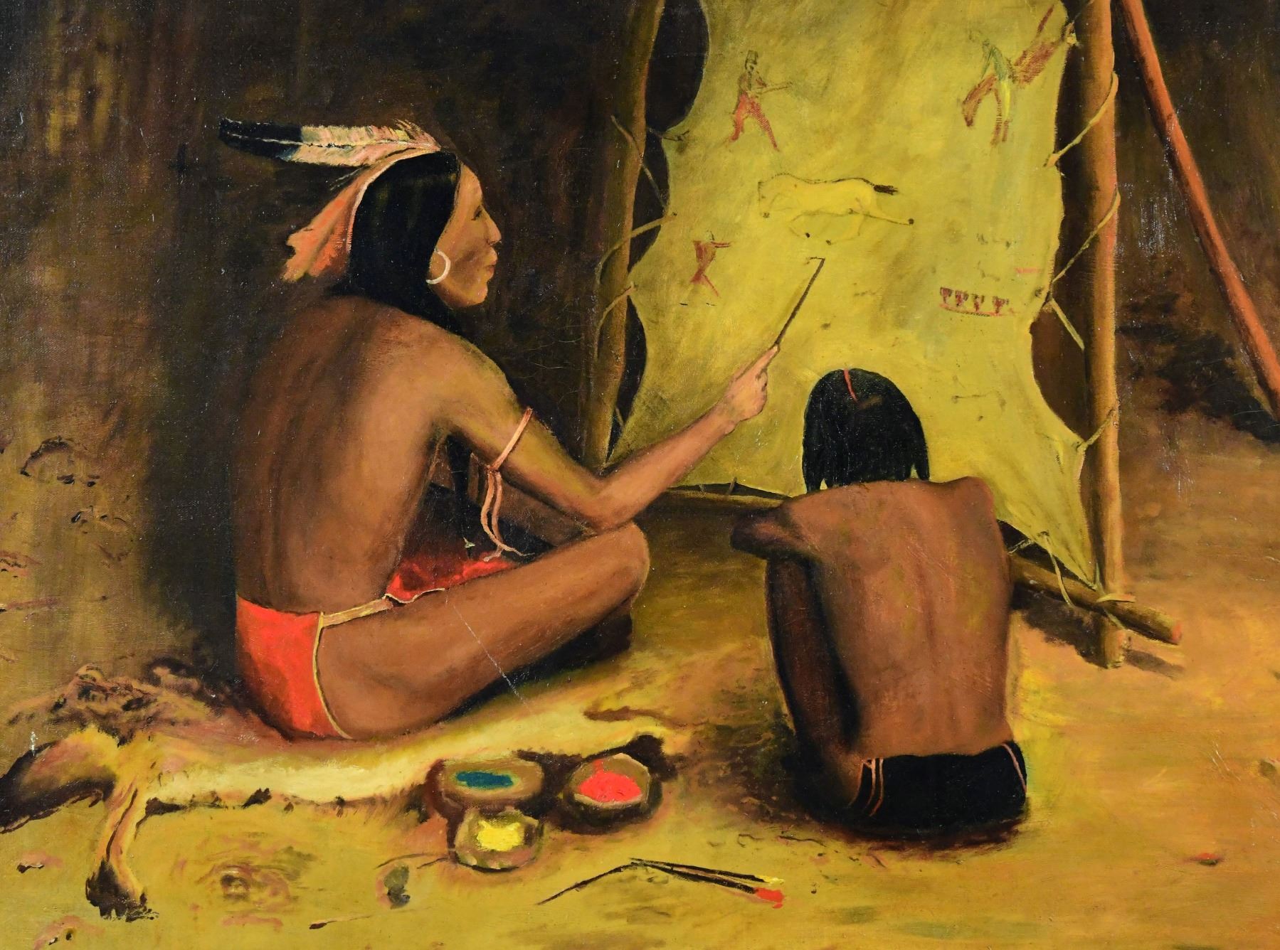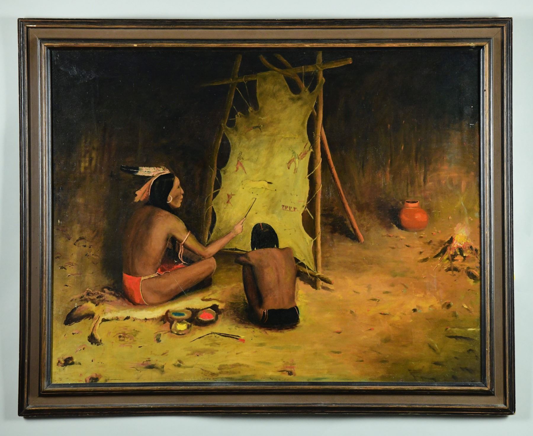 (American, 1866-1936) TO TEACH. This unsigned lined oil on canvas depicts a Native American teaching a young boy how to stretch an animal hide. Housed in a molded wood frame. SIZE: overall 42" x 52", sight 36" x 46". CONDITION: generally good. Re-lined. PROVENANCE: Lifelong California Collection. (05-988/TG). $800-1,200.