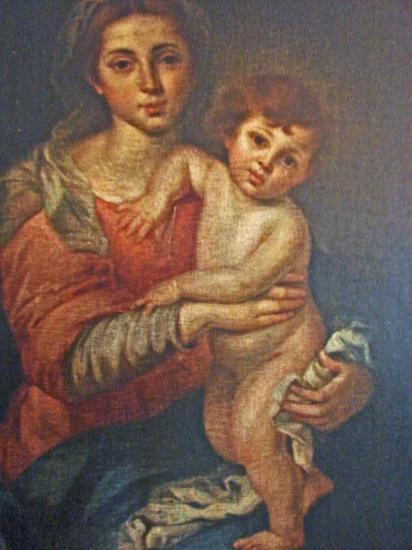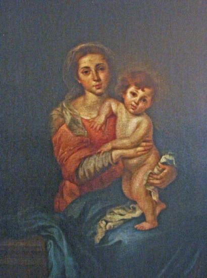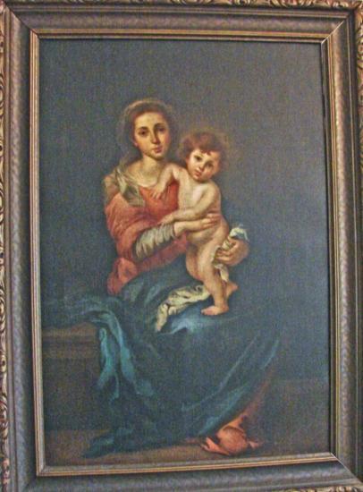 Oil on Canvas Madonna & Child by Esteban Murillo Original in Pitti Palace. Inscriptions verso on canvas include inEugenia - Marim - Florenze / Rue Serragliin. 37 1/4in x 25 1/2in s.s., in 19th Century gilt and gesso frame to 45 1/2in x 33 1/4in.