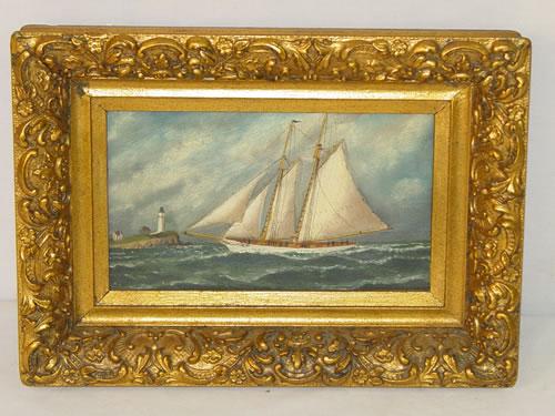 OIL ON CANVAS OF A 2 MASTED SCHOONER RACING TOWARDS A WHITE LIGHTHOUSE IN A PLASTER MOLDED FRAME (4 1/2" X 8") - PATCH ON BACK, MINOR IMPERFECTIONS, SPOT OF INPAINTING