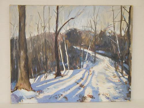 OIL ON CANVAS OF A FOREST LANDSCAPE IN WINTER SIGNED HEIDI COUTU (SPRINGFIELD MA ARTIST), UNFRAMED (24" X 30")