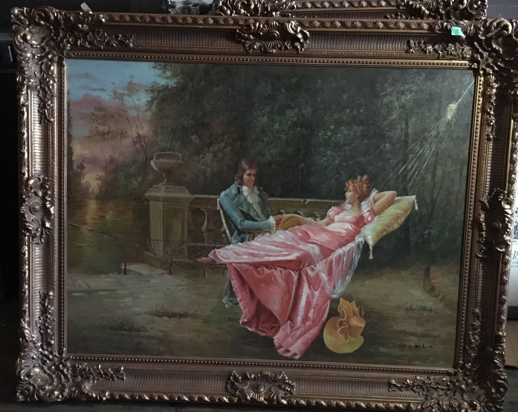 OIL ON CANVAS OF LADY IN HAMMOCK W/GENTLEMAN, HEAVY GILT FRAME, 48X36", SIGNED T. O. RIBEZ?