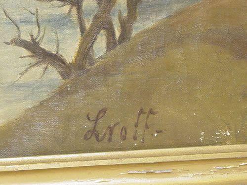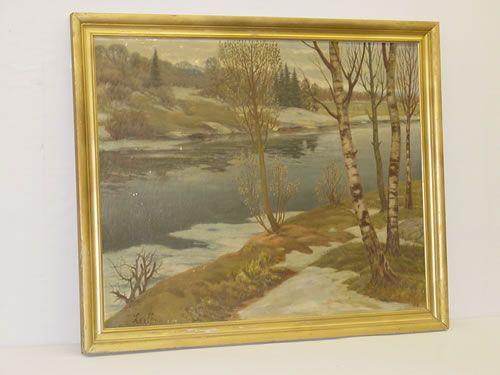 OIL ON CANVAS OF LAKE LANDSCAPE TITLED ON BACK "THE ICE BREAKS POUND N?", SIGNED LROFF ON LOWER LEFT (31" X 38 1/2") - CRAQUELURE & SPOTS OF PAINT LOSSES