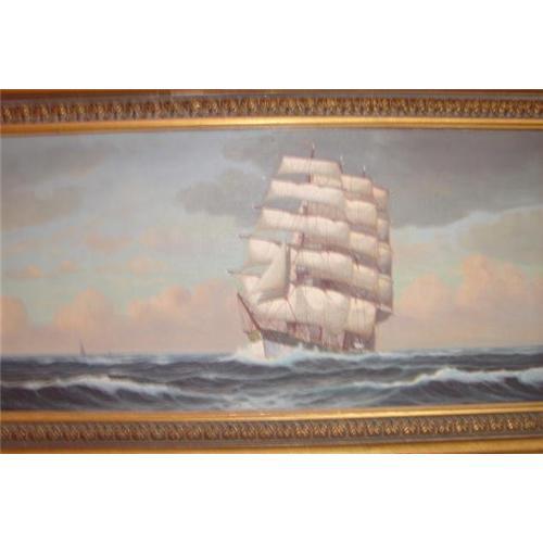 This is a 50 Year Old Nautical Clipper Ship, sailing on the big blue water. A real nice decorative painting at a reasonable price. The style and nature of this painting is in the manner of the well known English Maritime Artist, Montague Dawson. We have had many clients in the past that have purchased paintings with this look that are perfect for the office or that second home at the beach. This painting is mounted in a frame that measures 36 1/2" X 21 1/2".