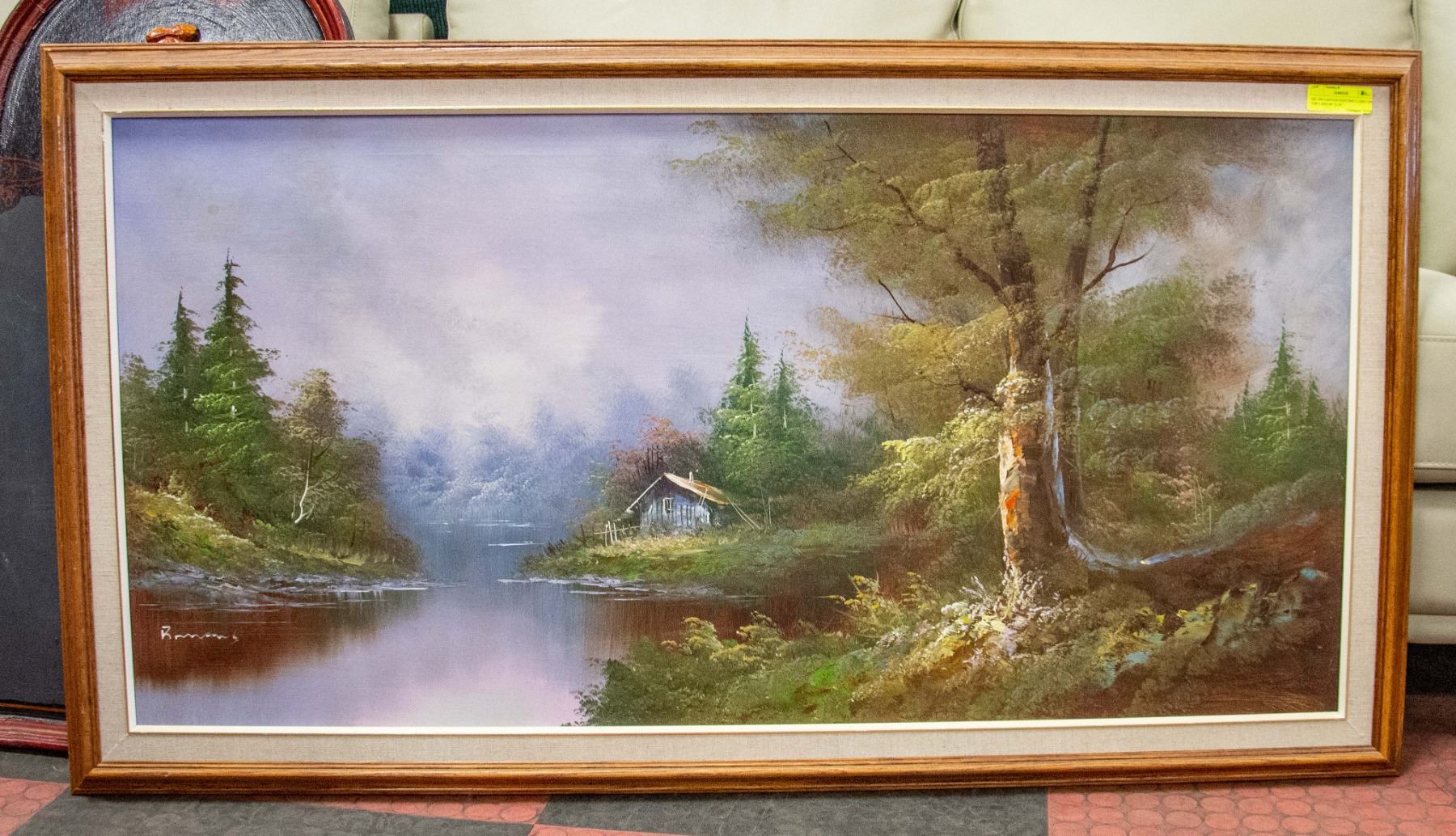 OIL ON CANVAS PAINTING CABIN ON THE LAKE 48" X 24"