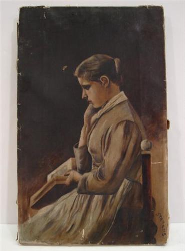 OIL ON CANVAS PAINTING. Depicts a seated female holding a book. Signed in lower right “Stevens:. Painting shows wear throughout. Unframed. 11” x 18”