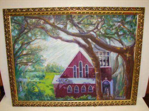 OIL ON CANVAS PAINTING. Depicts a church in a landscape scene. Signed in lower right “Lombard”. Painting rests in gilt wood & gesso frame. Frame shows loss to gesso at areas. 33” x 25” framed.