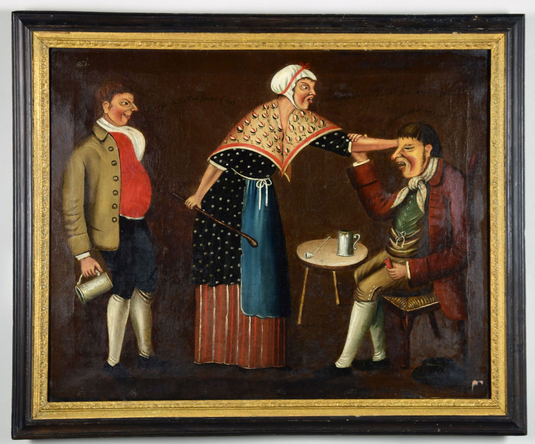 English School, 19th century. Oil on canvas depicts a parody of a drunkard featuring a red nosed patron seated at a tavern table drinking. A matron in bonnet and blue apron reaching for the man; a club in her right hand, while a second patron looks on with a stein in his hand. "You drunken old rascal", "Oh patience sweet wife and I'll never...". Housed in a molded wood frame with gold gesso liner. SIZE: overall 28" x 34", sight 24" x 30". CONDITION: surface cleaned. Good overall. PROVENANCE: from a Pennsylvania Estate Collection. (05-844/TG). $800-1,200.