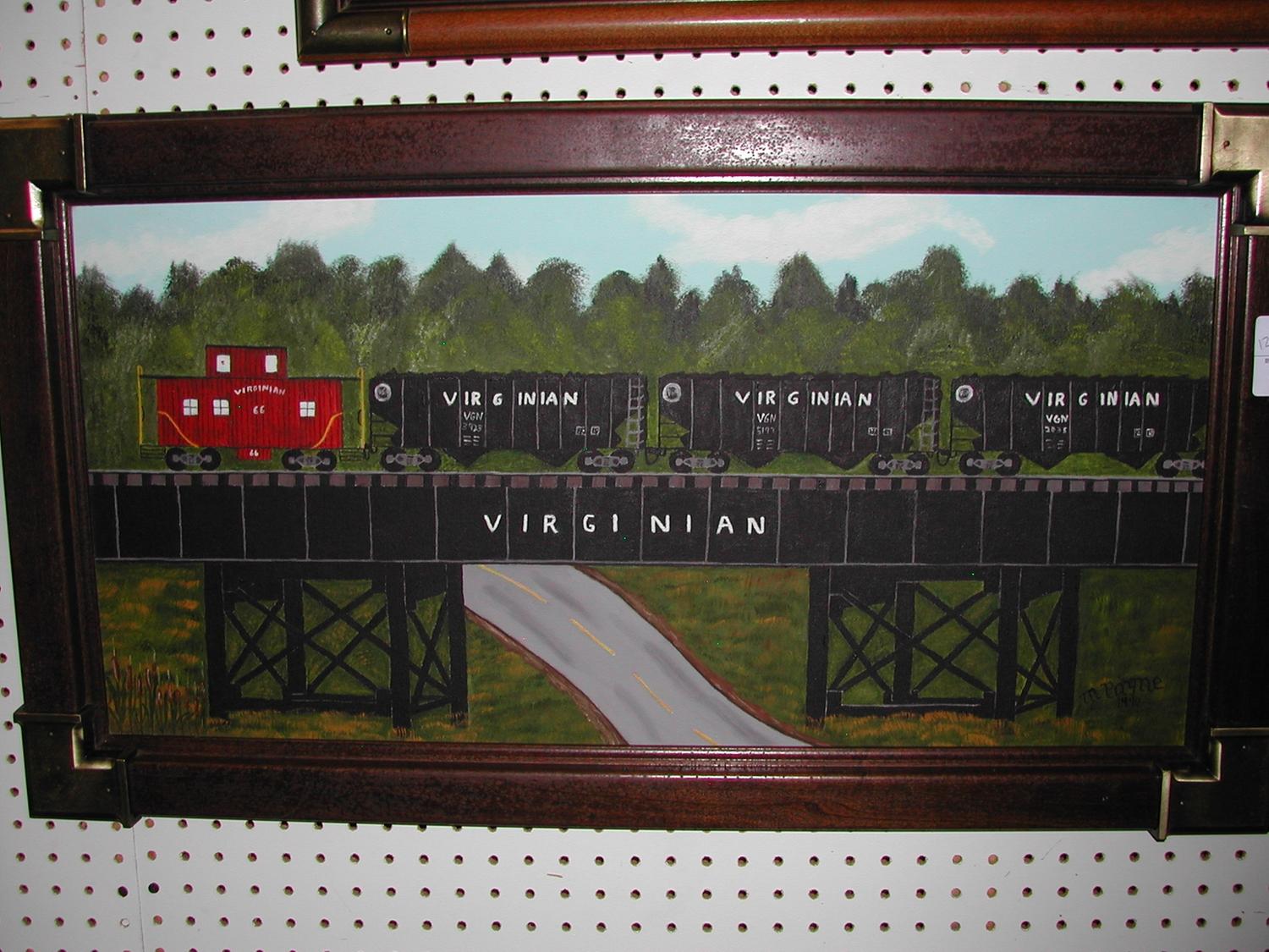 OIL ON CANVAS VIRGINIA LINE 3 COAL CARS AND CABOOSE ON TRESTLE, M. PAYNE 1990