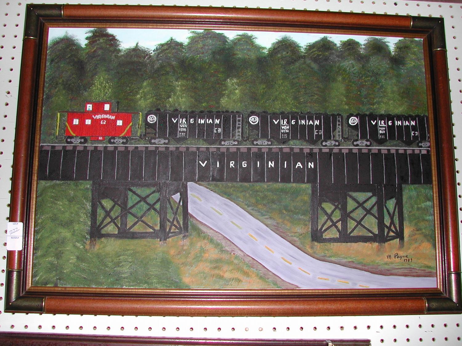OIL ON CANVAS, VIRGINIAN LINE 3 COAL CANS & CABOOSE, PAINTED BY M. PAYNE 1989 (20 X30)