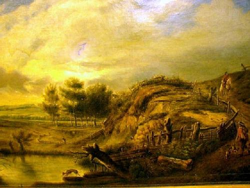 OIL ON CANVAS; Unsigned, landscape with figures and dogs, giltwood frame, 20" x 21-1/2", repair