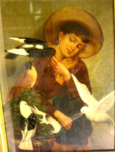 OIL ON CANVAS; Woman in hat with birds, signed lr. Rinaldi, 15" x 11", framed under glass, restored