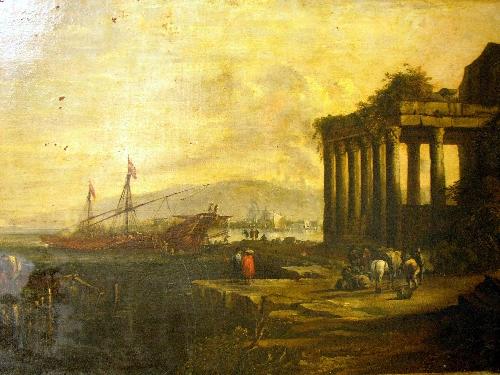 OIL ON CANVAS; Seascape with pillared building and figures in the fore-front, circle of Laurey de Castro, Italian 17th century,