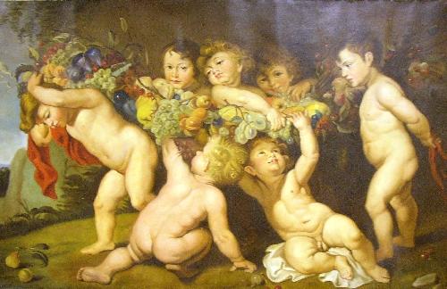 OIL ON CANVAS; Italian, depicting seven putti with fruit, without stretcher and unframed, minor losses, 38"h x 69"l