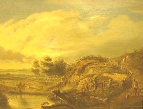 OIL ON CANVAS; Unsigned, landscape with figures and dogs, giltwood frame, 20" x 21-1/2", repair